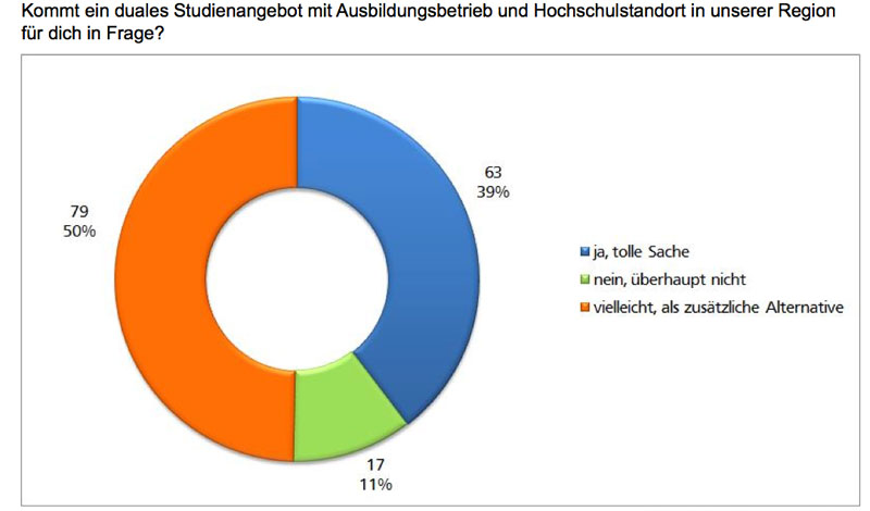 Das Interesse der Jugendlichen am Dualen Studium spüre die VR Bank Hessenland, die selbst 16 Absolventen beschäftigt,  in jedem Jahr bei der Nacht der Bewerber, wenn rund 600 Schülerinnen und Schüler durch die wechselnden Bankhäuser strömen, um sich anzuschauen, was Betriebe und Schulen ihnen bieten. In diesem Jahr startete die Bank dabei eine Umfrage, erläuterte Euler, deren Ergebnisse auf ungefähr 150 Antworten basieren. Die zeigten deutlich: 40 Prozent der Befragten würden nach der Schule ein Duales Studium vorziehen, die Hälfte ein Vollzeitstudium.