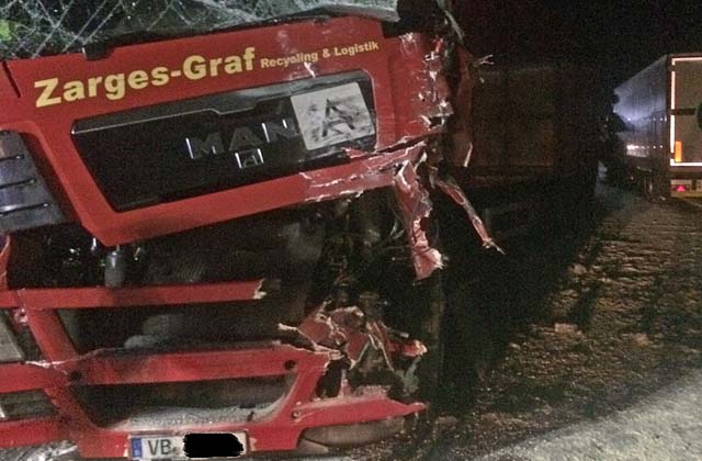 Durch die Wucht des Aufpralls wurde dieses Fahrzeug gegen den dahinter stehenden Lkw geschoben. Die Insassen von zwei der beteiligten Lkw wurden leicht verletzt. Der Fahrer des ersten stehenden, Lkw konnte sich vor dem Aufprall durch einen Sprung aus dem Führerhaus in Sicherheit bringen. Dabei verletzte er sich leicht.