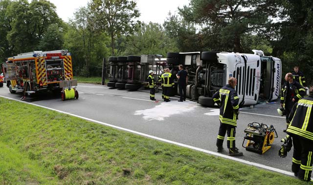 Unfall in der Nähe von altenburg – Lkw schleuderte und kippte um – Fahrer leicht verletztUmgekippter Lastwagen blockiert die B254