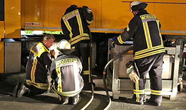 Das leckgeschlagene Fahrzeug manövrierte der Fahrer auf den Rasthof Pfefferhöhe und zog dabei eine mehrere Hundert Meter lange Dieselspur nach sich. Die Alsfelder Feuerwehr rückte mit drei Einsatzfahrzeugen zur Hilfe an, darunter den Gerätewagen für Gefahrgut.