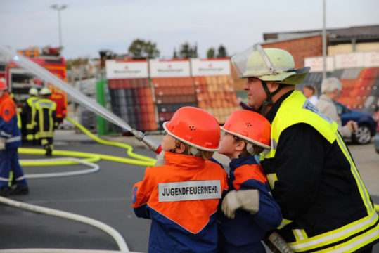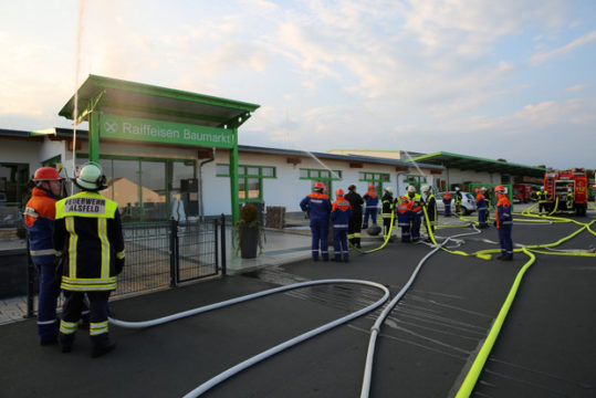 700 Liter Wasser pro Minute plätscherten auf das Dach des Raiffeisen Baumarktes bei der JahreshauptübungJugendfeuerwehr probte den Ernstfall