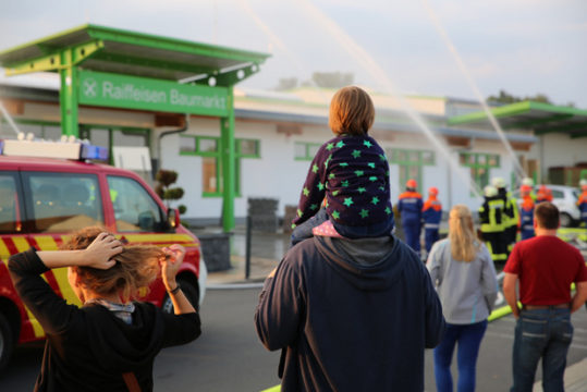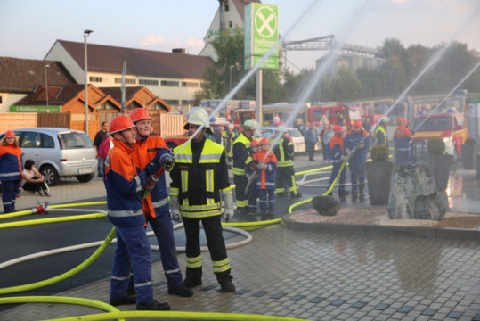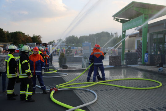 Unter den Augen von rund fünfzig Zuschauern startete der Feuerwehrnachwuchs die „Brandbekämpfung“ von außen auf das Gebäude, dazu waren sieben Strahlrohre im Einsatz. Zeitweise plätscherten über 700 Liter Wasser pro Minute auf das Übungsobjekt und die jungen Brandschützer hatten sichtlich ihre Freude. Unter den Zuschauern  war auch Marktleiter Heiko Schaaf, er zeigte sich über die Leistungen und das Engagement der jungen Feuerwehrleute erfreut. Für den Verlauf der Übung gab es von Jugendfeuerwehrwart Mathis Kruse ein großes Lob an die Mädchen und Jungen, aber auch an die Zuschauer. „Es ist immer etwas Besonderes, wenn einmal im Jahr die Leistung demonstriert wird“, so Kruse. Er betonte, dass die Jugendlichen die Hauptakteure des Abends waren und dies eindrucksvoll unter Beweis stellten, doch auch viele Helfer im Hintergrund ihren Teil dazu beitrugen.