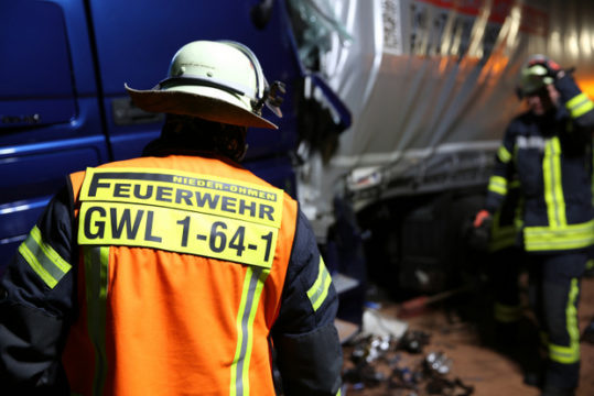 Für die Rettungs- und Bergungsarbeiten war die A5 rund eine Stunde voll gesperrt, es bildete sich ein kilometerlanger Rückstau. An dessen Ende prallten offensichtlich aus Unachtsamkeit drei Lastwagen aufeinander, dabei wurde einer der Fahrer schwer verletzt. Drei Rettungsteams und ein Notarzt waren zur Versorgung des Verunfallten im Einsatz. Die Feuerwehr aus Nieder-Ohmen musste bei diesem Unfall wieder anrücken, da erhebliche Mengen Diesel aus den verunfallten Lastwagen flossen und die Fahrbahn einem Trümmerfeld glich. Mit Bindemitteln, Besen und Schaufeln räumten die freiwilligen Feuerwehrleute erneut die Fahrbahn frei.