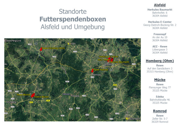 Die Standorte der Futterboxen in Alsfeld und Umgebung Foto: Tierschutzverein Alsfeld und Umgebung e.V.