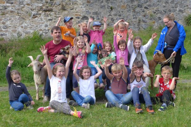 Schlosskids, Markus Haumann und Marie Bauer sowie die Schlossziegen Peperoni und Amadeus Foto: privat