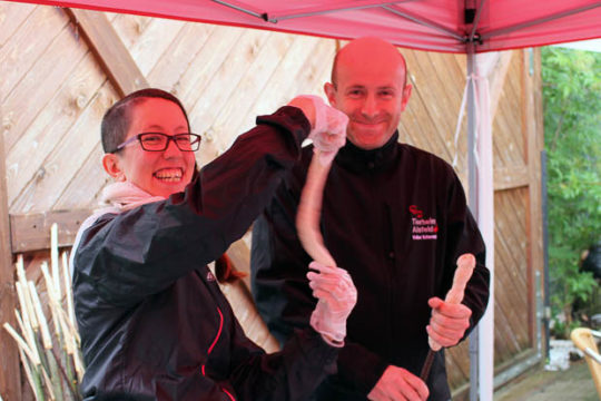 Zwischen sommerlichen Cocktails, vegetarischen Leckereien vom Grill und selbst-gemachtem Stockbrot, gab es nicht nur Zeit für ausgiebige Unterhaltungen, sondern auch für die Tiere, denn die durften an dem Abend natürlich nicht zu kurz kommen. „Wir haben uns schon öfter gedacht, dass es doch gerade im Sommer schade ist, dass die Tiere abends bei den Temperaturen alleine sind. Also haben wir uns kurzerhand gedacht, wir organisieren mal einen Sommerabend im Tierheim“, erklärte der Pressesprecher Volker Schwenzfeier. Gesagt, getan. Neben einem geselligen Zusammenkommen stand hier das auf dem Programm, was normalerweise am Tag gemacht wird.