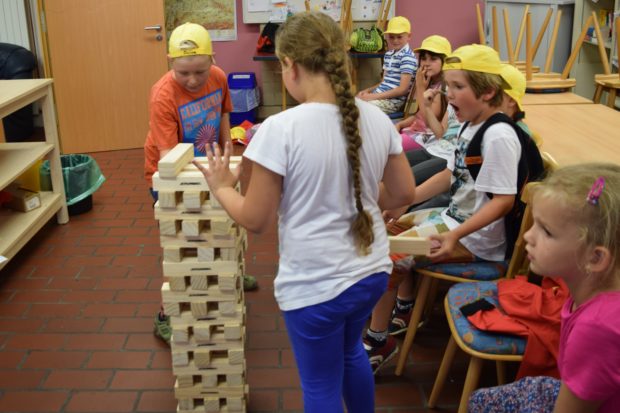 Zum Mittagessen ging es mit den hungrigen Rätsellösern in den Alsfelder Kartoffelsack, wo man sich mit einem leckeren Mittagessen für den Nachmittag stärken konnte. Da zog das Wetter aber einen Strich durch die Rechnung. Kurzerhand wurde das geplante Spielefest in das Café Online verlegt und an verschiedenen Stationen boten sich tolle Spielmöglichkeiten. Von Leitergolf, Menschenmemorie bis hin zu Jenga XXL spielten die begeisterten Kinder um den Sieg.