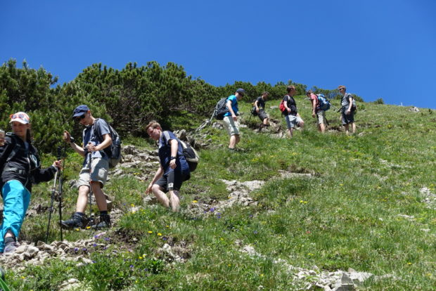 Hier erforderte der Anstieg nicht nur Trittsicherheit, sondern auch eine gute Kondition und Schwindelfreiheit. So anspruchsvoll war dieser Anstieg, dass hier und da bereits die Hände eingesetzt werden mussten – umso glücklicher und auch ziemlich stolz waren die jungen Wanderer, als sie am Gipfelkreuz auf 2.170 Metern Höhe ankamen. Belohnt für diese Mühen wurde die Gruppe mit einer ausgiebigen Rast und einem tollen Ausblicken über die Allgäuer Berge.