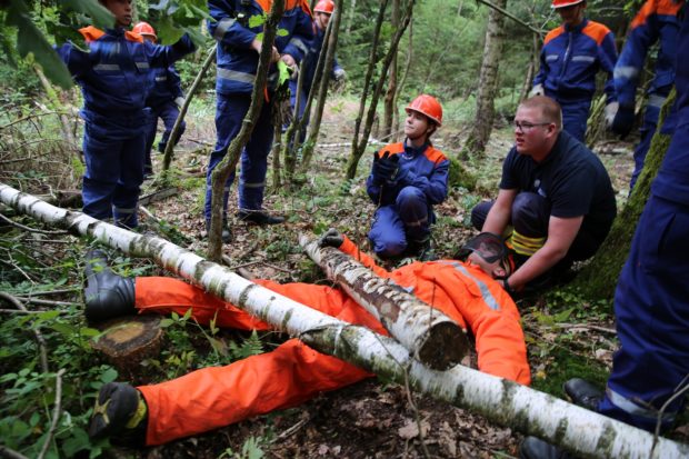 Auf einem Feldweg bei Alsfeld wurde für die jungen Helfer mit Kakao und Wasser eine täuschend echt aussehende Ölspur auf den Asphalt gezaubert. Mit Besen und Bindemittel in Form von Sägespänen wurde das gestellte Malheur von den Jugendfeuerwehrleuten rasch beseitigt. Einen Teddybären „retteten“ die Jugendfeuerwehren am Samstagnachmittag in Eifa. Der plüschige Prankenbär steckte in einer Baumkrone fest und musste mit einer Steckleiter aus seiner misslichen Lage befreit werden. Im Wald bei Hattendorf galt es einen unter Baumstämmen verschütteten Forstarbeiter zu retten.