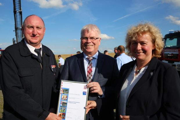 Stadtbrandinspektor Thomas Stein, Staatssekretär Werner Koch und Bürgermeisterin Claudia Blum mit der Urkunde der Auszeichnung. Foto: privat