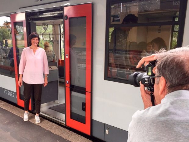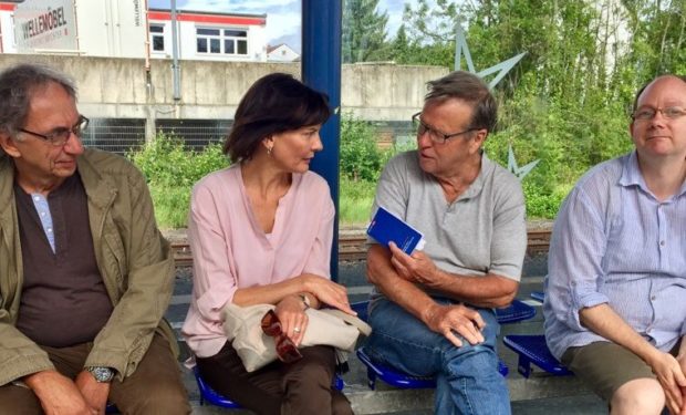Der Rundgang startete am Alsfelder Bahnhof. Marc Lerch, Sprecher der örtlichen Grünen, begrüßte die eintreffenden Teilnehmer und Teilnehmerinnen während Eva Goldbach bereits ein kurzes Presseinterview gab. Lerch machte unterdessen auf die Situation des Bahnhofs in Hinblick auf die Mobilität aufmerksam. Dieser sei noch nicht barrierefrei, besäße keine Toiletten und auch Sitzgelegenheiten seien nicht ausreichend vorhanden.