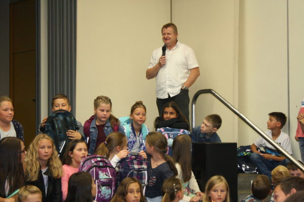 Einen solchen bunten und abwechslungsreichen Schulalltag ermöglicht auch der Förderverein der Schule. Dessen Vorsitzender Dieter Welker nutzte die Anwesenheit der neuen Eltern, um ein wenig Werbung für diese Institution zu machen, die jährlich etwa fünf- bis zehntausend Euro in den Schulbetrieb gibt, um diese „ohnehin schon sehr gute Schule noch ein wenig besser zu machen.“ Mit Hilfe von Partner aus der Region, sowohl aus der Wirtschaft als auch aus anderen Bereichen, gelingt es dem Verein, viele einzelne Projekte zu unterstützen, die über das Schulbudget hinausgehen: Eine Boulderwand und einen Pumptrack an dem Standort in der Schillerstraße hat der Förderverein mitfinanziert, er ist beteiligt an der Ausstattung der Bibliothek und des naturwissenschaftlichen Sektors, er unterstützt Lesungen und Kunstprojekte. Mit einer Mitgliedschaft werde man auf jeden Fall zum Wohl der Schule und damit der Kinder tätig sein.