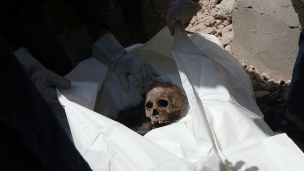 Dieser Schädel gehört zu anderen menschlichen Knochen, die nach einer Zeit von mehreren Monaten endlich aus den Trümmern des Hauses von Amers Familie geborgen werden konnten.