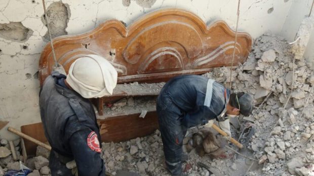 Helfer suchen in den Trümmern des Hauses nach den sterblichen Überresten von Amers Familie. Foto: Amer Ibrahim