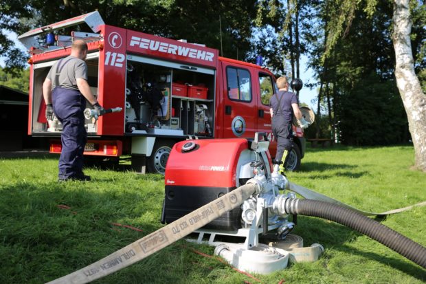 Zur Rettung der Fische und ihres Lebensraumes rückte am Mittwochabend die Freiwillige Feuerwehr der Gemeinde Lautertal an. Wie Einsatzleiter Sebastian Wulff schilderte, soll über den Einsatz von mehreren Pumpen der Sauerstoffgehalt in dem Gewässer verbessert werden. Rund zwanzig Feuerwehrleute aus Dirlammen, Eichenrod und Hörgenau sind unter anderem mit drei tragbaren Kraftspritzen und einem Löschfahrzeug vor Ort im Einsatz. Insgesamt sechs Wasserwerfer spritzen derzeit fast 5.000 Liter Wasser pro Minute ab und sollen so für eine Zirkulation und Anreicherung des Wassers mit Sauerstoff sorgen.