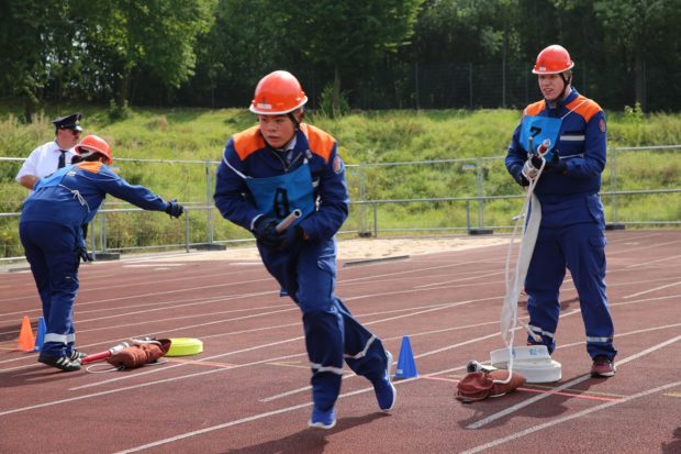 Bei dem Wettbewerb der Jugendfeuerwehr ging es um zwei Parts, dem sogenannten A-Teil und B-Teil. Während im A-Teil ein fehlerfreier Löschangriff auf Zeit vorgeführt werden musste, wartete im B-Teil ein 400 Meter langer Staffellauf mit Hindernissen. Nach dem Kommando „Auf die Plätze – fertig – los!“ starteten die neunköpfigen Gruppen oder die sechsköpfigen Staffeln auf den Parcours. Bei den Hindernissen galt es Ausrüstungen anzulegen, einen Schlauch aufzuwickeln oder zielgenau mit einen Leinenbeutel zu werfen. Im A-Teil war binnen sieben Minuten ein Löschangriff auf einer 800 Quadratmeter großen Fläche durchzuführen. Schläuche an eine Feuerwehrpumpe kuppeln, über einen Wassergraben springen oder einen Tunnel passieren, all dies waren Bestandteile.