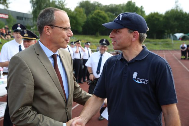 Alsfelds Bürgermeister Stephan Paule zeigte sich über den großen Feuerwehrbesuch in einem Grußwort erfreut. „Wenn alle Hessischen Feuerwehren und Jugendfeuerwehren sich in Alsfeld treffen, dann ist das etwas ganz Besonderes“, so der Bürgermeister. Weitere Grußworte sprachen der Direktor der Hessischen Landesfeuerwehrschule Erwin Baumann, der Landesfeuerwehrverbandsvorsitzende Ralf Ackermann, der Landesbranddirektor Harald Uschek sowie die Landesjugendfeuerwehrwarte Markus Potthof und Michael Wickenhöfer. Der Feuerwehr der Stadt Alsfeld wurde dabei für die Ausrichtung der Landesentscheide durchweg gedankt.