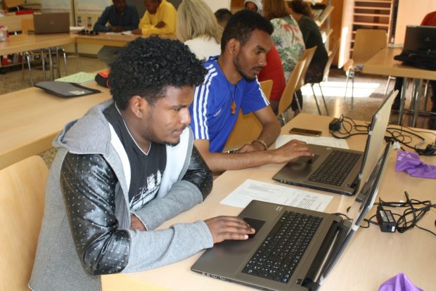 „Unsere Kurse können auch diejenigen Geflüchteten oder andere Migranten besuchen, die noch keine offiziellen Kurse des Kreises bezahlt bekommen“, ergänzte Lotz, „darüber hinaus richten wir uns an Menschen mit Alphabetisierungsbedarf, also Lese- und Schreibanfänger, genauso wie an diejenigen, die schon gute Grundkenntnisse haben und diese erweitern wollen.“ Der Stamm an Freiwilligen, die dieses Angebot mittragen, mache diese Differenzierung möglich. Neben diesem Angebot könne man im Selbstlernzentrum auch den Umgang mit Computern und wichtigen Programmen erlernen; darüber hinaus unterstützen die Freiwilligen im Selbstlernzentrum die Schülerinnen und Schüler auch beim Verfassen von Bewerbungsschreiben.