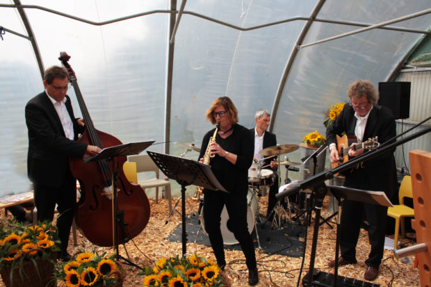 Musikalisch umrahmt wurde die Veranstaltung von einem Quartett aus Lehrkräften und einer Mitarbeiterin der Lauterbacher Musikschule. Es spielten Christine Eisler (Saxophon), Michael Jakob (Kontrabass), Berthold Möller (Drums) und Rolf Jacob (Gitarre). Tobis Hoffmann, Geschäftsführer des Trägervereins Hilfe für das verlassene KIND e.V., moderierte den Festakt und überreichte den Rednern im Anschluss jeweils eine der 50 Sonnenblumen, die die Bühne schmückten.