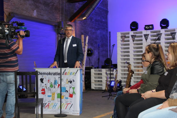 Das Vogelsberger Kreisjugendparlament macht auch nach 25 Jahren noch Schule: 1992 als erstes dieser Art in Deutschland gegründet, wird es auch heute noch als positives Beispiel aktiver Jugendbeteiligung wahrgenommen – sogar im Bundesfamilienministerium, wie Referatsleiter Thomas Heppener bei der großen Jubiläumsveranstaltung am Samstag im Alsfelder Güterbahnhof betonte. Und auch Dr. Oliver Märker von der Agentur für crossmediale Bürgerbeteiligung, der die Demokratiekonferenz am Nachmittag moderierte, versprach, das Vogelsberger Beispiel noch weiter bekannt zu machen.
