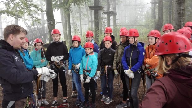 Alle Klassen der Jahrgangsstufe 7 erkundeten begeistert den Kletterwald Hoherodskopf. Konzentriert wird die Einweisung dazu verfolgt.