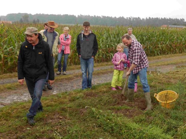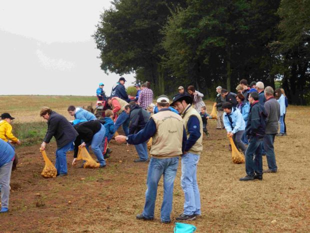 Um die Mittagszeit beziehungsweise am frühen Nachmittag steht dann wieder die traditionelle Kartoffelernte wie anno dazumal an. Die Kartoffeln werden mit einer historischen Maschine „ausgeschleudert“ und können anschließend von den Besuchern eingesammelt und natürlich selbst verwendet werden. Auch ein Kartoffelfeuer darf auch in diesem Jahr nicht fehlen.