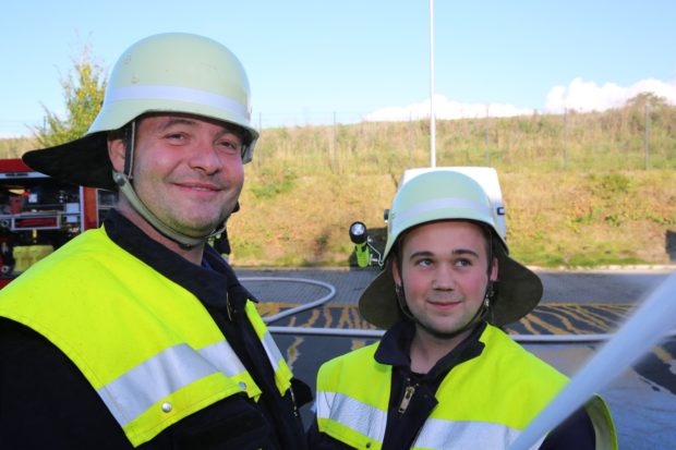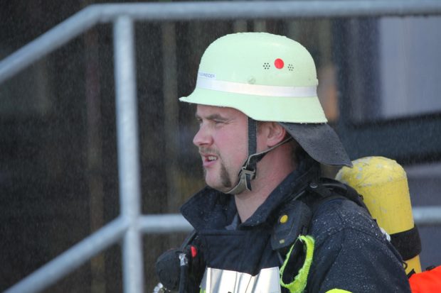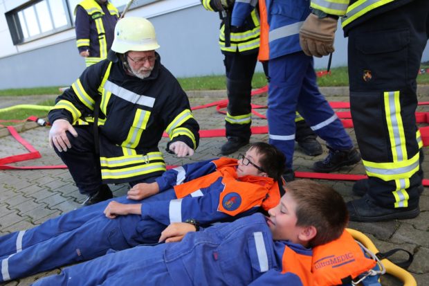 Der Schwerpunkt lag auf der Rettung der Arbeiter, bei denen es sich um vier Darsteller der Jugendfeuerwehr handelte. Gleich mehrere Atemschutztrupps waren dazu gefordert, die mit Hohlstrahlrohr, Axt und Leuchte erfolgreich suchten. Für die Bekämpfung der fiktiven Flammen wurde Löschwasser aus Hydranten entnommen, so konnte über mehrere Strahlrohre und die Drehleiter ein massiver Löschangriff durchgeführt werden.