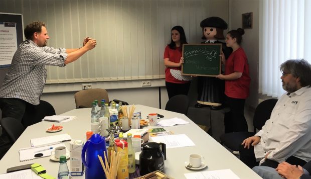 Heute sind die Jugendlichen nicht nur stolz auf den Erfolg, den sie mit den bisherigen Ausstellungen bereits hatten – ca. 1.650 Besucher haben sie bereits gesehen -, sondern sind sich auch einig, dass es sich für sie persönlich sehr gelohnt hat, an diesem Projekt mitzuwirken. „Wir haben uns intensiv mit Themen auseinandergesetzt, die auch mit uns zu haben, obwohl sie schon so alt sind“, berichtet Francine Euler, die wie Doreen Peppler ebenfalls als ehrenamtliche Jugendliche an dem Projekt mitgewirkt hat. Die beiden Jugendlichen stellten eine Station der Ausstellung vor und unterstrichen, wie viel Freude die Aktionen machen. „Unsere interaktiven Angebote regen zum Nachdenken an und machen Spaß“, finden sie: „Man kann einen persönlichen Lebenszeitstrahl erstellen, seine persönlichen Thesen annageln und ein mittelalterliches Kochbuch basteln – und das ist noch längst nicht alles.“ Dekan Dr. Jürgen Sauer lobte in der Konferenz die Ideen und das Engagement der jungen Menschen. „Es ist schön, dass es hier nicht nur etwas zu sehen, sondern auch zum Mitmachen gibt, das sowohl zum Nachdenken als auch zum Lachen anregt.“