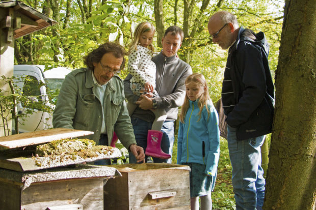 Blick in einen Bienenstock: Peter Knodel (links) zeigt, daß die Honigbienenvölker auch im Herbst noch aktiv sind und Vorräte für den Winter anlegen. Foto: Volker Schwenzfeier