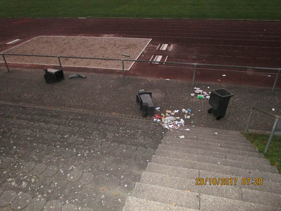 Anders sah es noch am Morgen aus, als der Hausmeister des Erlenstadions gegen 7 Uhr das Sportgelände betrat. Die vier Dachrinnenfallrohre wurden abgerissen und verbogen, ein Mülleimer wurde samt Betonpfosten aus dem Boden gezogen und ein Fenster wurde mit einer Wodkaflasche eingeschlagen, hinter die der Hausmeister im Zuge der Aufräumarbeiten bereits eine Ersatzscheibe montierte. Die Dachrinnen wurden beschädigt, Mülltonnen wurden auf der Tartanbahn umgestoßen, Glasflaschen wurden auf der Bahn zerschmettert und die Scherben in der Sandgrube und auf der Bahn verteilt. Das erste Mal sei das allerdings nicht gewesen.