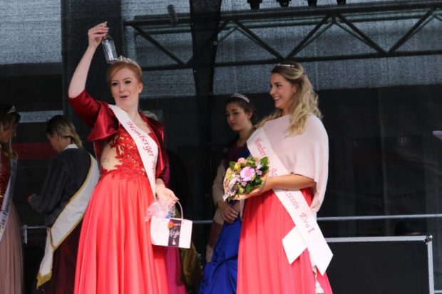 Am Sonntagvormittag jedenfalls, als alle gespannt auf die Krönung der Homberger Apfelprinzessin warteten, war der Platz vor der Bühne gutgefüllt, nicht zuletzt, weil die Zeremonie von zwei ganz wunderbaren Tanzauftritten der Mädchentanzgruppen „Bella Ragazza“ und „Fantasy“ des Tanz- und Aerobic-Studios „Topfit“ flankiert wurden, die dem Regenwetter mit ganz viel Freude trotzten. Glanzvoll wurde es laut Pressemitteilung danach auf der Kamax-Kultur-Bühne, denn neben der amtierenden Homberger Apfelkönigin Lea I. waren noch vier weitere Hoheiten aus der Region auf das Fest der Homberger gekommen: Svenja, Bierkönigin aus Lauterbach, Stefanie, Korn-Königin aus Schlitz, Saskia, Mittelpunkt-Königin aus Mücke-Flensungen und Jasmin, die Quellenkönigin aus Bad Vilbel, waren der Einladung von Lea gefolgt, die diese gerne bei der Krönungszeremonie ihrer Prinzessin Eva I. dabei haben wollte.