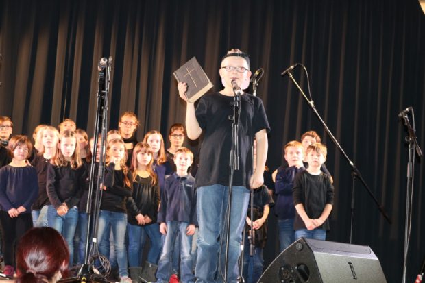 Viele Kinder schlüpften im Lauf des Musicals in die Rolle von Martin – eine Basecap zeigte an, wer gerade den Reformator spielte; eine gute stilistische Idee, die sowohl bei den Kindern als auch bei den Gästen sehr gut ankam. Mit dem Lied „Gloria in excelsis Deo“ wurde aus Martin ein Mönch, der die Liebe Gottes kennenlernte und nach vielen inneren Kämpfen und noch mehr Überlegungen und durch das Studium der Bibel zu der Erkenntnis kam, dass die Menschen von aller Not allein durch Gnade, durch Glaube und durch Liebe gerettet werden können: „Gott liebt uns, auch wenn wir Fehler machen!“ Nach dem mitreißenden Stück „Allein durch Gnade“ fiel es dem Publikum sichtlich schwer, dem Wunsch des Pfarrers nachzukommen und sich den Applaus für das Ende des Musicals aufzuheben. Was hier noch mühsam gelang, brach sich nach dem nächsten Stück Bahn.