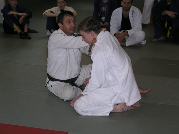 Sein Training begann mit einem sogenannten Takedown für den Wettkampf. Danach ging es weiter mit Techniken aus der Spiderguard, einer speziellen Halteposition am Boden, und im Kampf sehr gut anwendbaren Hebeltechniken, die er spielend leicht demonstrierte, was bei vielen Anfängern für ungläubiges Kopfschütteln und bei den Fortgeschrittenen für grinsende Gesichter sorgte. Für die fortgeschrittenen Kampfkünstler hatte Schira viele Feinheiten und Raffinessen auf Lager, womit selbst bekannte Techniken um ein vielfaches effektiver wurden.
