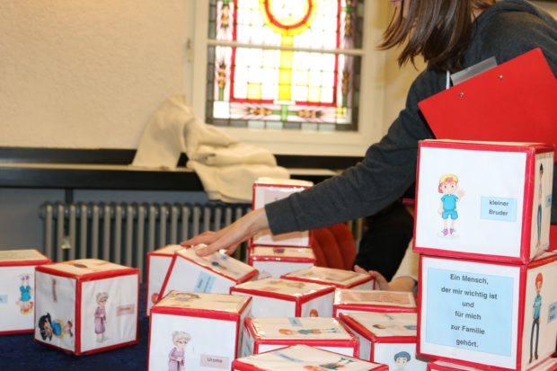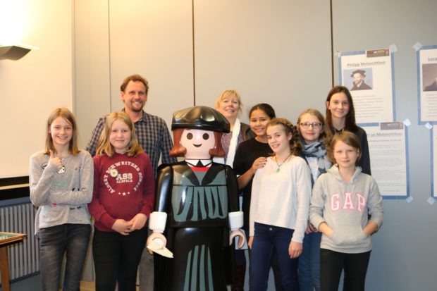 In der Ausstellung gab es viele verschiedene Mitmach-Stationen. Unter anderem konnte man sich in ein Gästebuch eintragen und seine eigene Meinung zu der Ausstellung schreiben oder seine Ziele und Wünsche an eine Tür nageln. Eine Station ist ihnen besonders gut in Erinnerung geblieben. Dort ging es darum, ein Selfie mit einer lebensgroßen Luther-Playmobil-Figur zu machen und es an einen beliebigen Freund zu schicken. Dabei sollte man sich fragen, was Freundschaft für einen bedeutet. Genauso gut fanden sie die Station, in der man sich einen eigenen Anstecker mit der Luther-Rose gestalten konnte.