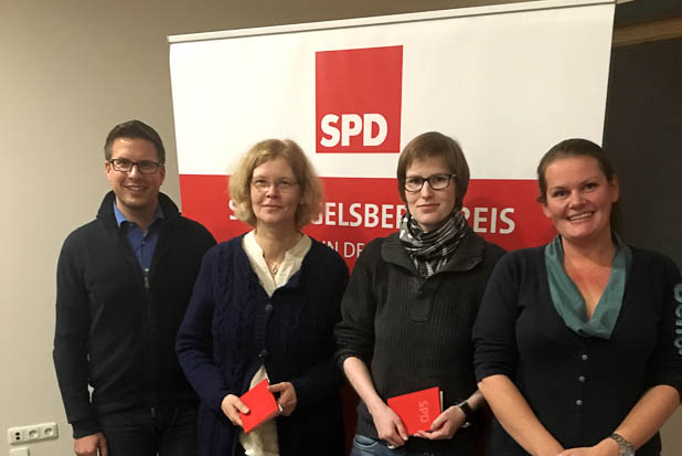 Ute Ehlert und Susanne Wienold (Mitte) erhalten ihre neuen SPD-Parteibücher von Swen Bastian und Stephanie Kötschau. Foto: Heiko Müller