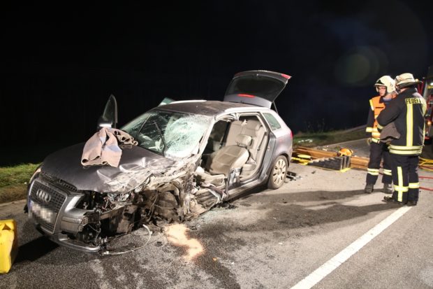 „Der Autofahrer konnte nicht mehr Ausweichen“, sagte ein Polizeisprecher am Unfallort. Über rund 100 Meter verteilte sich auf der Landesstraße ein Trümmerfeld mit Glassplittern und Metallteilen.