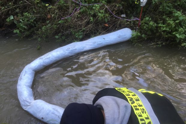 Eine Ölsperre wird auf dem sichtbar mit Öl verunreinigten Wasser ausgebracht. Foto: privat