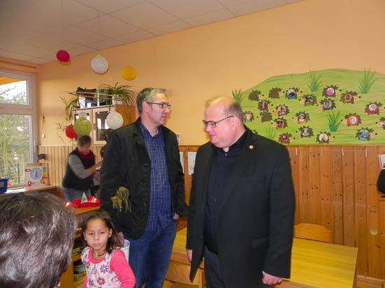 Stefan Riegelmann und Bürgermeister Stephan Paule im Kindergarten „Bechtelsberger Strolche“. Fotos: Oberhessen-live