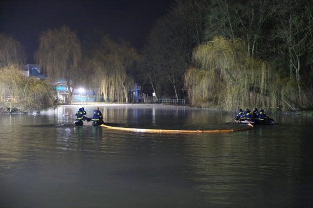 ALSFELD (ol). Tag acht des Ölunfalls in Alsfeld: Das Technische Hilfswerk startete am Freitag einen Großeinsatz. Einheiten aus Alsfeld, Erlensee, Frankfurt, Lauterbach und Schwalmstadt wurden von der Unteren Wasserbehörde des Vogelsbergkreises am Erlenteich zur Hilfe gerufen.