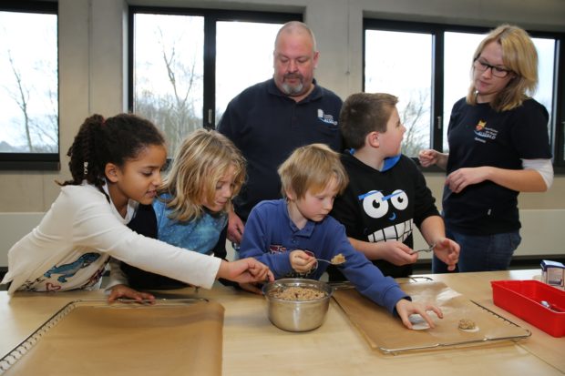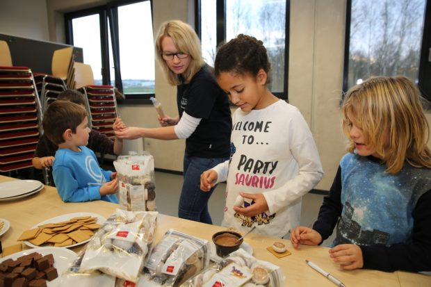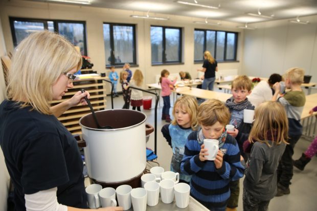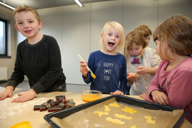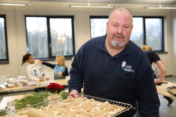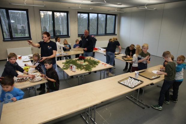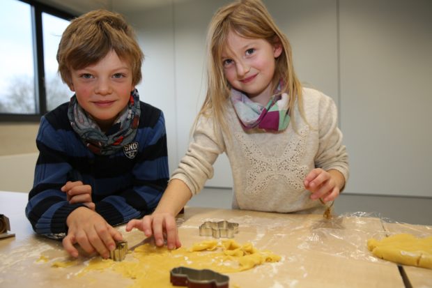 Vor dem Besuch des Weihnachtsmannes übten sich die rund zwanzig Mädchen und Jungen im Plätzchen backen. Vom klassischen Butterkeks bis hin zu Nussmakronen reichten die Kreationen, die natürlich mit viel Zuckerkonfekt verziert wurden. Hier und da wurde schon während dem Backen reichlich genascht und es gab heißen Kakao.