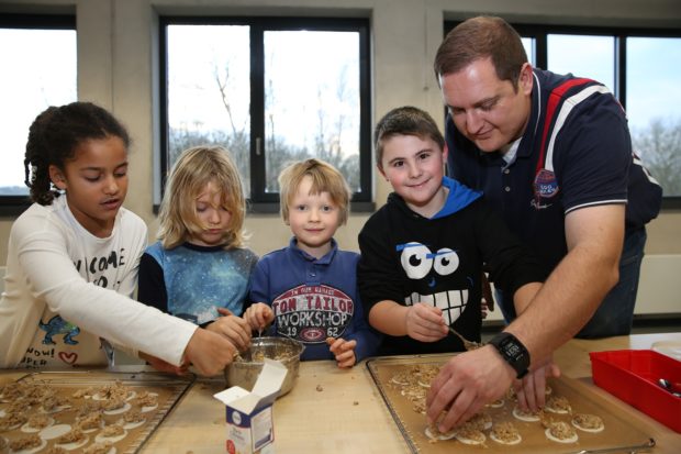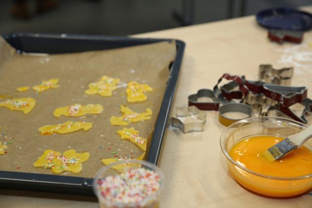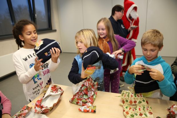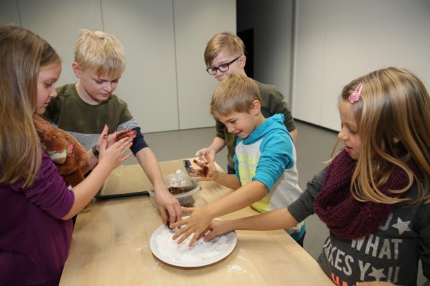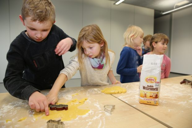 Vor dem Besuch des Weihnachtsmannes übten sich die rund zwanzig Mädchen und Jungen im Plätzchen backen. Vom klassischen Butterkeks bis hin zu Nussmakronen reichten die Kreationen, die natürlich mit viel Zuckerkonfekt verziert wurden. Hier und da wurde schon während dem Backen reichlich genascht und es gab heißen Kakao.