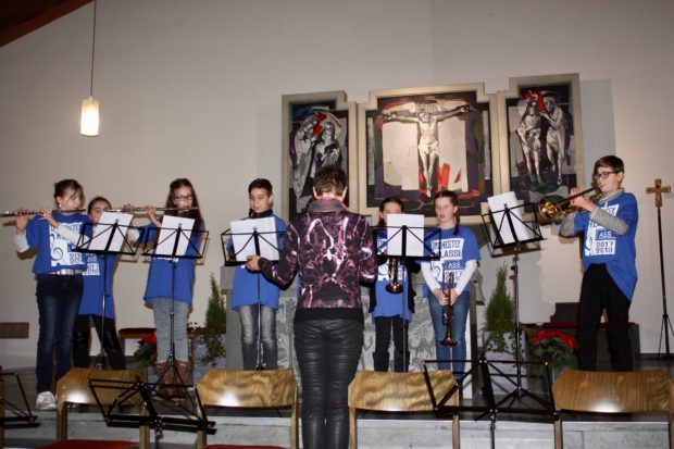 Eingeteilt war der Abend in einen Block mit den jüngeren und einen mit den älteren Schülerinnen und Schülern. Den Start machte – auch das hat fast schon Tradition – Sonja Karl an der Orgel: „Wir sagen euch an den lieben Advent“ erklang es durch das Kirchenschiff, und schon machten sich die Streicher der Klasse 5 auf die Bühne, um unter der Leitung von Arno Pausch sowohl das bekannte „Jingle Bells“ zum Besten zu geben, als auch „Eine Melodie von Mozart“, nach einem französischen Kinderlied. Sehr passen für die Zeit war auch „Am Weihnachtsbaume die Lichter brennen“. Ulrike Schimpf hatte dieses Stück mit der Bläserklasse 5 einstudiert. Beide Ensembles spielen erst seit Sommer auf ihren Instrumenten – und beeindruckten daher ganz besonders.