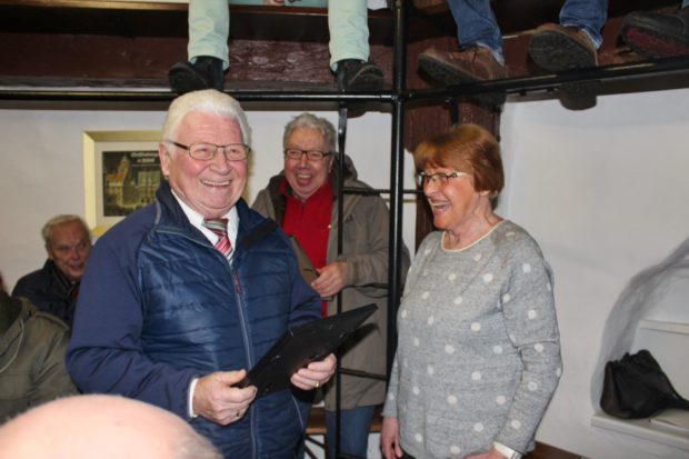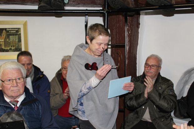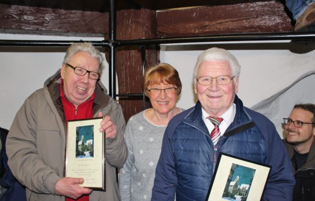 Anschließend ehrte sie den engagierten „Sangesbruder“ Hans Buchhammer für seine 40. Teilnahme am Christkindwiegen und ihren Ehemann, Hans-Werner Kober, für die 60. Teilnahme. Hans-Otto Schneider erhielt eine außergewöhnliche Ehrung: Zum 59. Mal nahm er an der Tradition teil, allerdings zum 50. Male als Dirigent auf dem Turm.