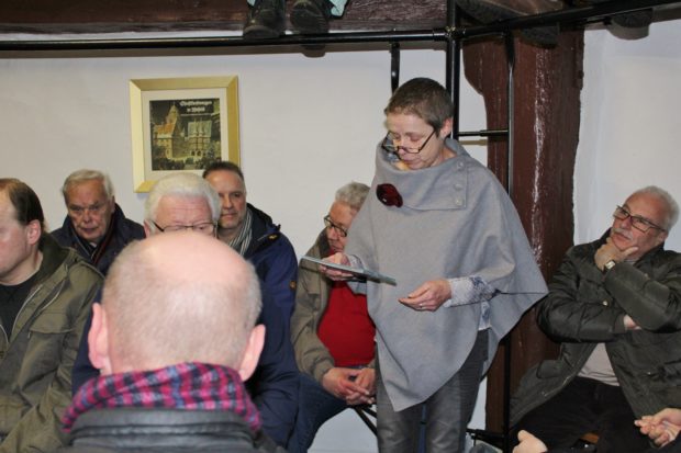 Auch in diesem Jahr war Dr. Monika Hölscher wieder dabei und berichtete von neuen Informationen aus der Alsfelder Heimatgeschichte. Die Historikerin stellte Oskar Staab vor, der Bürgermeister Alsfelds in der frühen Nachkriegszeit, genauer vom 15. Juni 1945 bis 31. März 1946, war. Dabei hob sie besonders hervor, dass Staab mit seiner Ehefrau, der Halbjüdin Elisabeth, trotz starken Drucks aus dem Regierungsdirektorium Darmstadt, zusammenblieb. Er habe sich „trotz aller Repressalien nicht von seiner ‚jüdischen‘ Frau scheiden lassen, wie das viele andere getan hatten“, erklärte Hölscher auf dem Kirchturm.