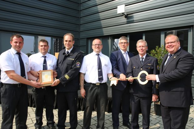 Mit einer symbolischen Shclüsselübergabe sowie einem Eintrag in das Goldene Buch der Stadt Alsfeld wurde die neue Feuerwache offiziell eröffnet. Von links: Vizestadtbrandinspektoren Kevin Planz und Carsten Schmidt, Kreisbrandinspektor Dr. Sven Holland, Stadtbrandinspektor Daniel Schäfer, Landrat Manfred Görig, Landesbranddirektor Harald Uschek und Bürgermeister Stephan Paule. Fotos: privat