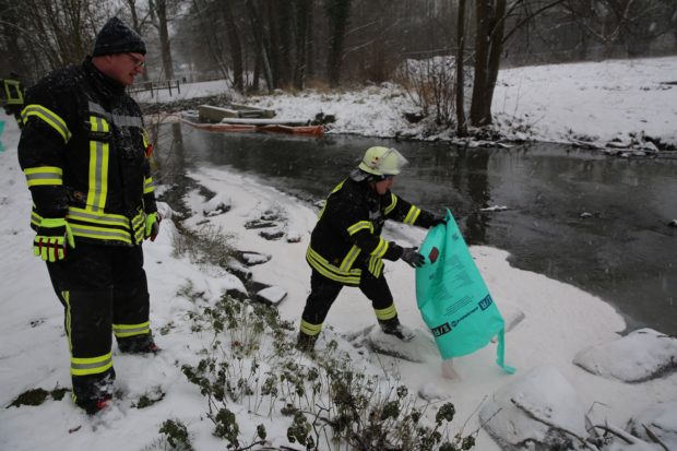 Auch am Erlenteich, dort hätte der Simmereinsatz einer Reinigungsfirma keinen Erfolg erzielt. „In der Theorie hatte man sich einen guten Erfolg erhofft, in der Praxis hat es nicht funktioniert“, so einer der vor Ort eingesetzten Ingenieure. Aus diesem Grund musste das mit Bindemitteln gebundene Öl mit Sperren abgefischt und dann aufgesaugt werden. Dazu kamen Ehrenamtliche des Technischen Hilfswerks zum Einsatz, da am Wochenende keine Spezialfirma zur Verfügung stand. „Die Ehrenamtlichen der Feuerwehr wollte man bewusst nach mehrtägigem Einsatz bei Schnee, Regen und Temperaturen unter dem Gefrierpunkt nicht erneut fordern“, so Dr. Mischak. Wie er sagte, ist der Einsatz des THWs in Rücksprache mit der Stadt Alsfeld erfolgt. Er unterstrich im gleichen Atemzug die hervorragende Zusammenarbeit von Unterer Wasserbehörde, Feuerwehr und THW.