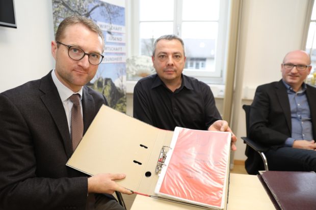 Der Vogelsbergkreis hält einen ständig aktualisierten Alarmplan für den Gewässer- und Bodenschutz vor, den Kreis-Umweltdezernent Dr. Jens Mischak und Umwelt-Ingenieur Markus Wörner hier zeigen. Foto: privat