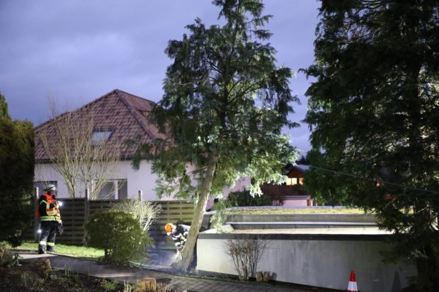 Mit einer Seilwinde und einer Motorkettensäge fällten Feuerwehrleute den Baum und verhinderten so einen Sturz auf die Garage. Wieso der Baum in solch eine Schieflage geraten konnte, ist noch unbekannt.