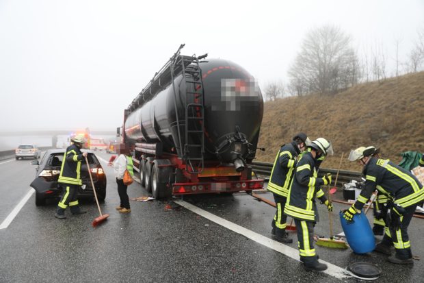 Tanklastzug prallt in Stauende - Drei verletzte Personen - Probleme mit RettungsgasseVerkehrsunfall zwischen vier Fahrzeugen