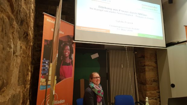 Die zweite Referentin des Abends war die „Süd-Nord-Freiwillige“ Anitha Andrews, die am ev. Dekanat Alsfeld sowie an der Albert-Schweitzer-Schule Alsfeld tätig ist. Sie stammt aus dem indischen Kerala und konnte in ihrem Vortrag sehr gut die Situation der Frauen in Indien darstellen.